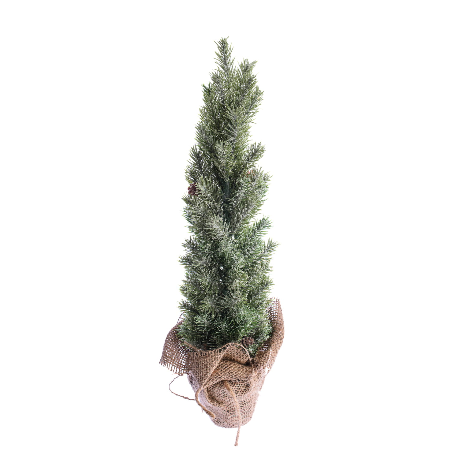 Mała choinka wsparta na doniczce owiniętej jutą.