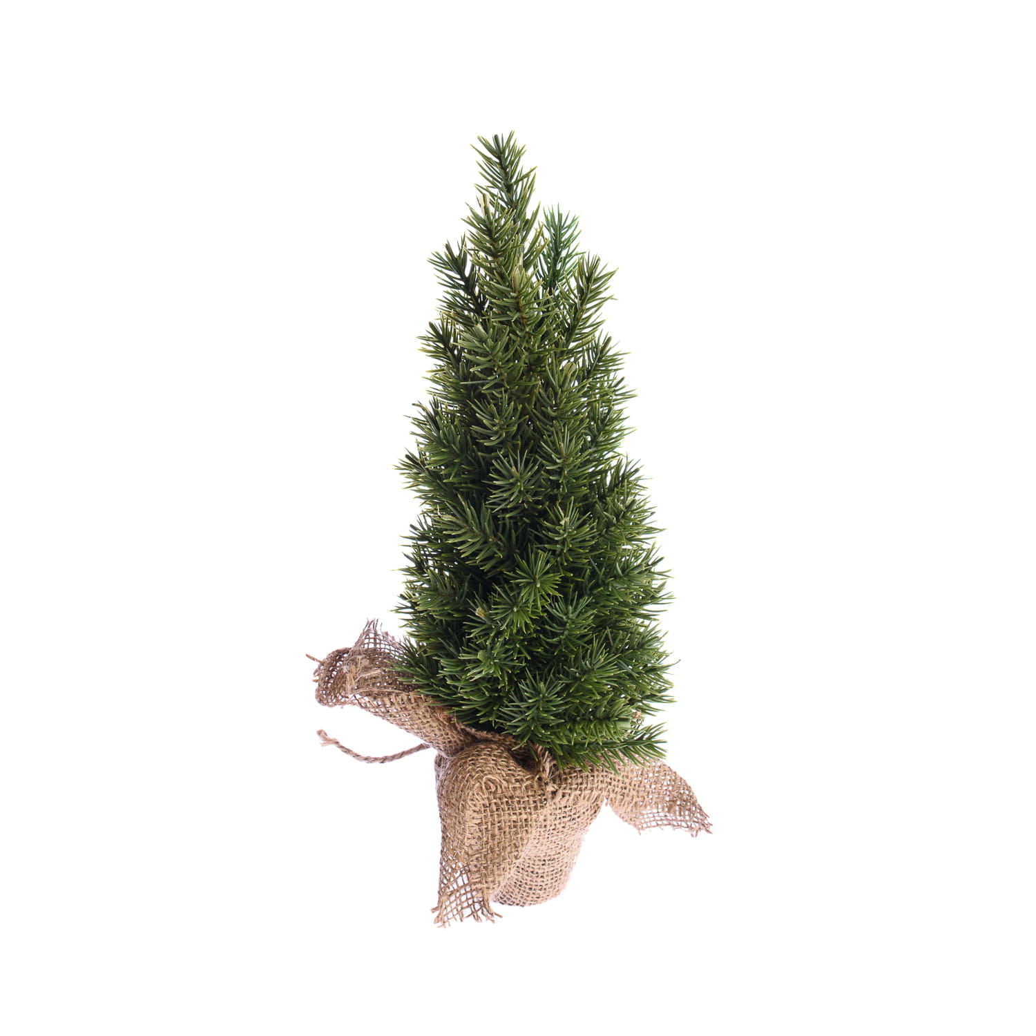 Mała choinka wsparta na doniczce owiniętej jutą.